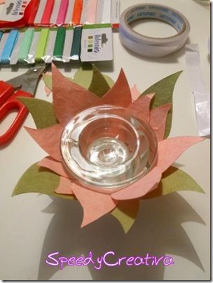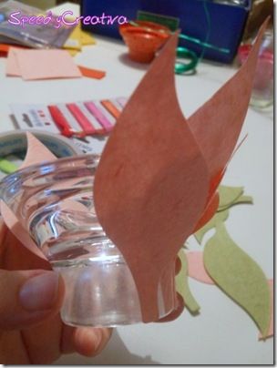 Incolla uno strato di biadesivo alla base del portacandele, applicando sopra prima uno strato di foglie rosa, poi verdi.