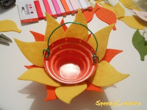 Per prima cosa Barbara ha creato il manico del cestino utilizzando il filo di ferro. Ha passato il filo in due buchini del portacandela fermandolo con la pinza.