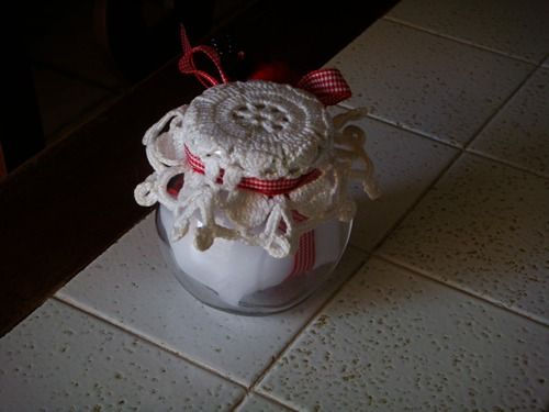 Franca ha fatto passare il nastro nei buchi del centrino, per poi legarlo attorno al coperchio del contenitore in modo da fissarlo.