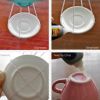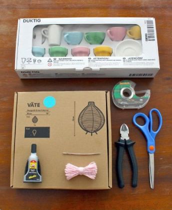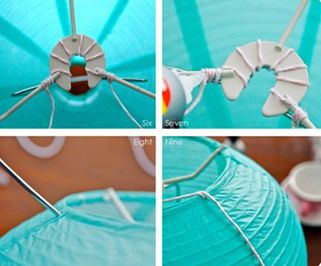 Come prima cosa Nicx ha tagliato con una pinza il filo della corrente per eliminarlo dalla lampada. Ha poi legato lo spago al supporto interno della lampada cucendolo anche al coprilampada per renderlo più sicuro e stabile. Ha poi passato lo spago sotto il piattino della tazzina da caffè in modo da farlo rimanere sospeso.Da ultimo ha incollato la tazzina sul piattino in modo da non farla cadere. Non rimane che appendere la mongolfiera appena creata, e iniziare la festa!