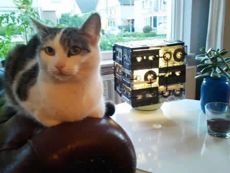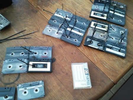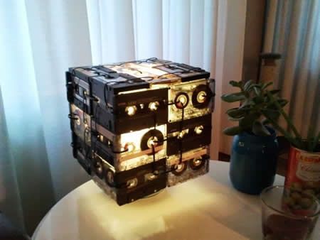 L'autrice di questa modifica ha creato una specie di cubo senza un lato, creato legando insieme con lo stesso nastro le musicassette l'una con l'altra e letteralmente infilando il tutto a mo' di cappello sulla lampada.