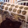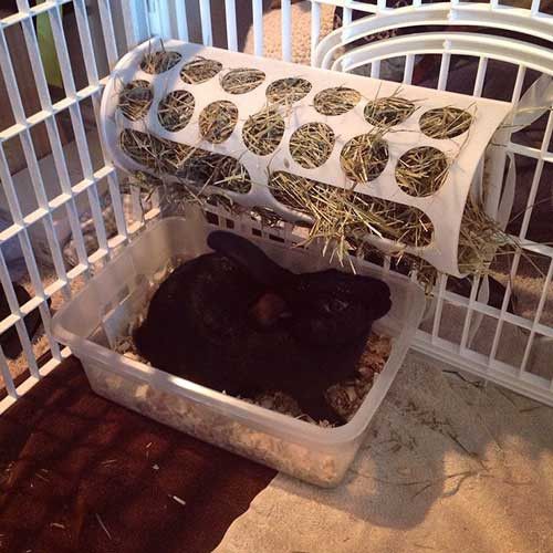Si tratta semplicemente di fissare il dispenser con delle fasciette o della corda alle pareti della gabbietta e riempire il tutto con del fieno.