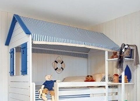 La parte inferiore non è stata utilizzata come letto bensì come ripostiglio per i giochi dei bimbi, chiudendo il tutto con delle simpatiche tendine dello stesso colore del tetto.