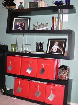 L'autrice di questa idea ha preferito utilizzare della colla per fissare le mensole verticali LACK larghe 30 cm in modo da evitare di forare eccesivamente il muro.
